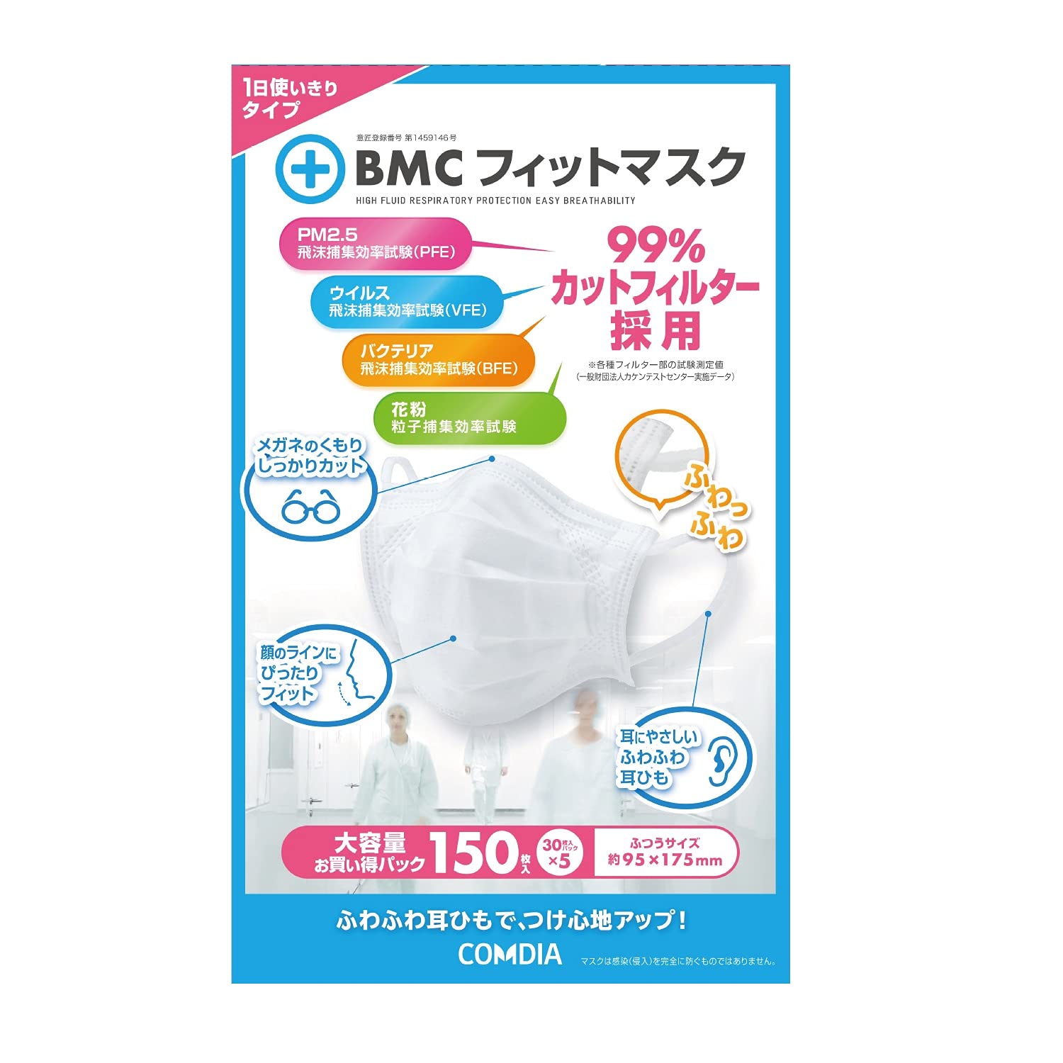 BMC Comdia 口罩 150枚 (3 Packs of 50) 17.5cm成人 白色 BFE >99% PFE >99% VFE >99%(日本最高標準) 花粉、細菌etc.