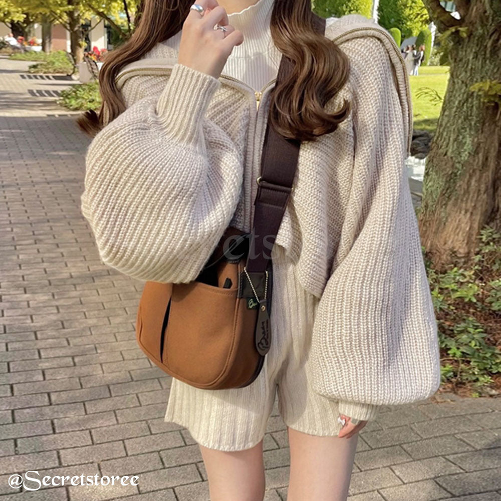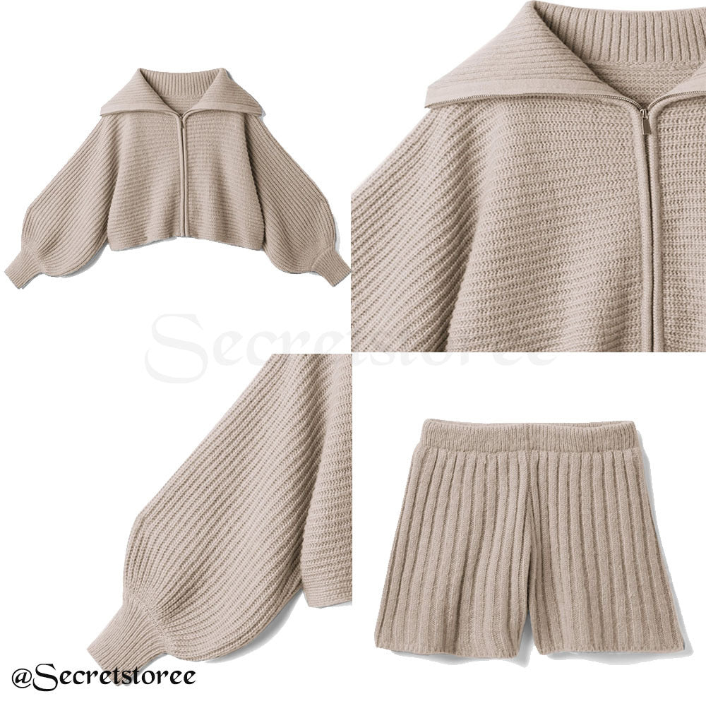 🇯🇵日本 泡泡袖拉鍊針織外套連短褲套裝 2件套 mb1471