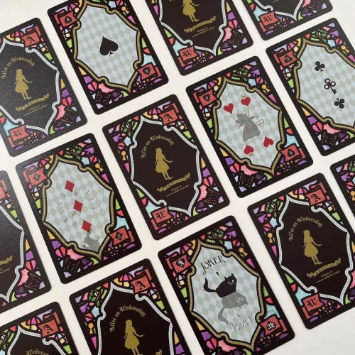 1 盒 55隻原創設計愛麗絲啤牌咭佢係半透當有一個隱藏的角色或當你把它放在燈上時佢就會好似彩繪玻璃一樣變半透明啊!!真係超級靚!
